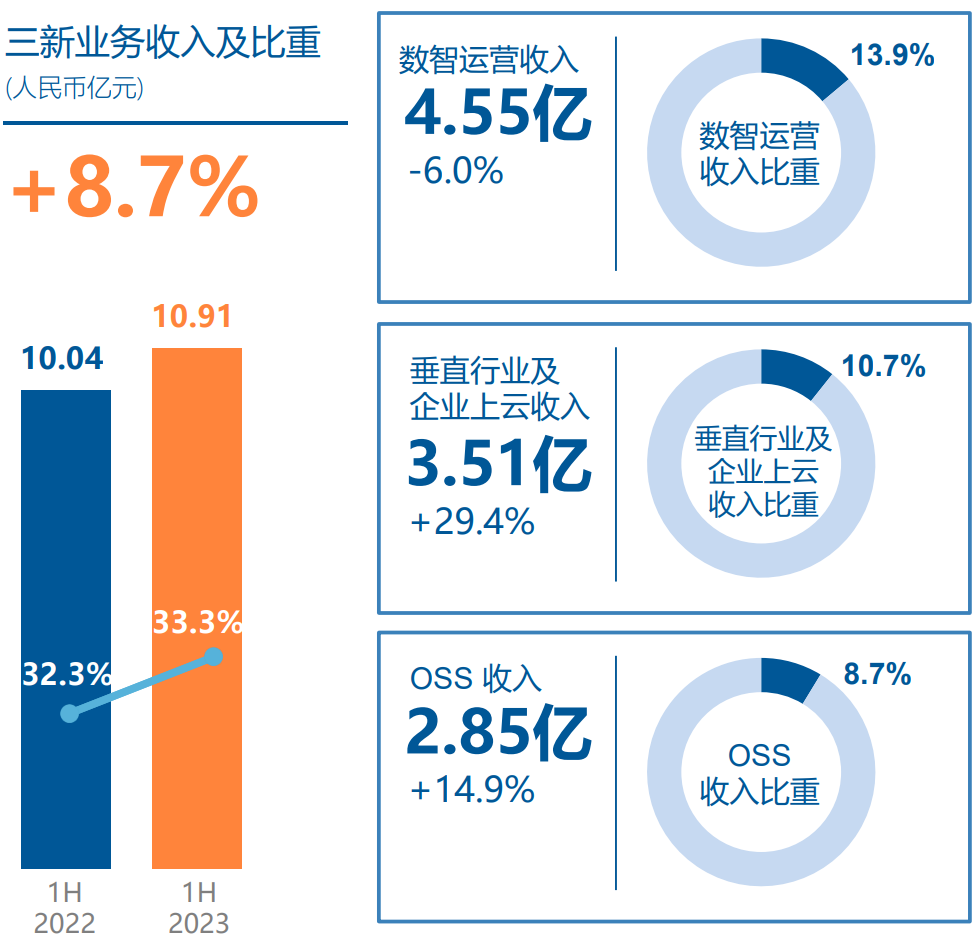 上半年,运营商在算力网络、自智网络和传统网管的升级换代给304am永利集团带来更多机会,这也使三新业务当中OSS收入达人民币2.85亿元,同比上升14.9%,占总体收入比重8.7%。